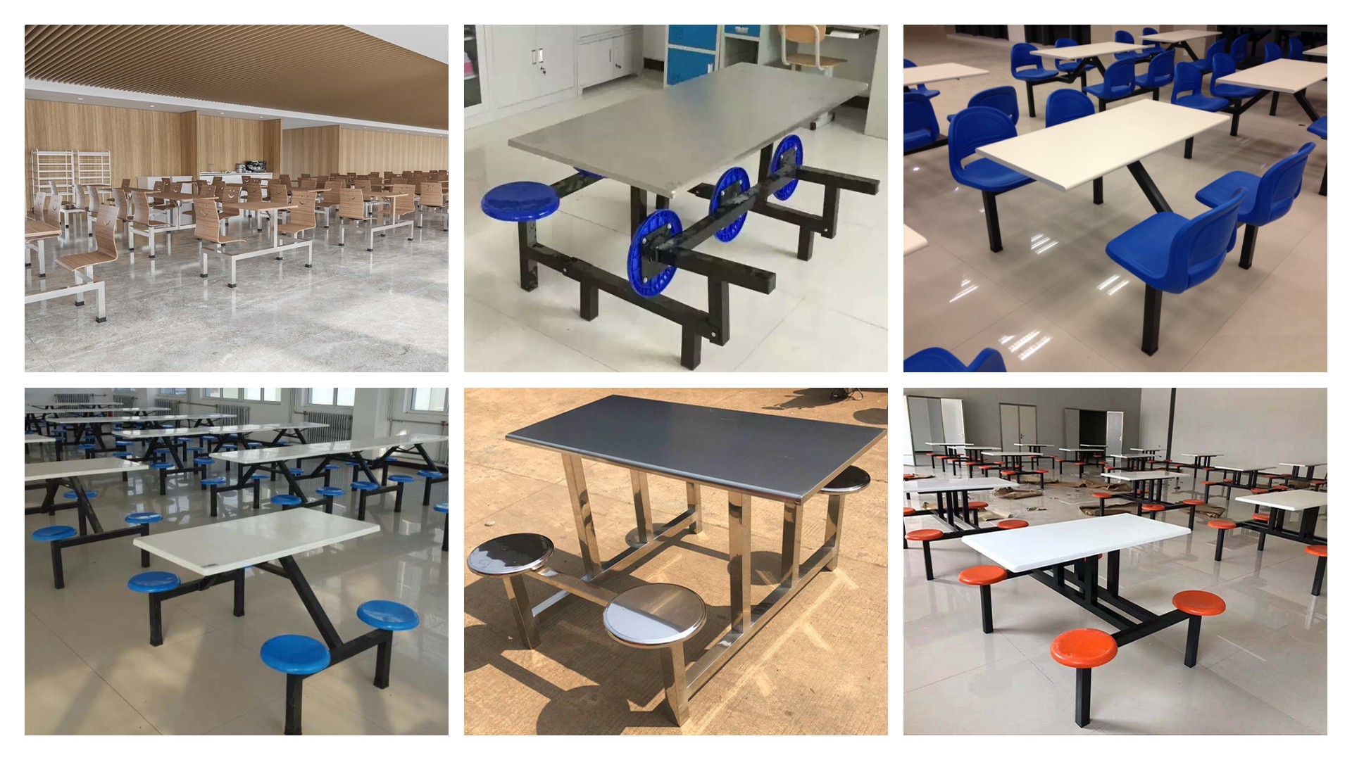 食堂餐桌用材比較廣泛,多以桌面與座椅相連接的款式為主。高度以720mm-760mm為標(biāo)準,餐桌椅是人類日常生活和社會活動中使用的具有坐臥、憑倚、餐食等功能的器具。通常由若干個零、部件按一定接合方式裝配而成。給大家用餐時使用的桌椅,鋼木結(jié)構(gòu)居多,結(jié)構(gòu)簡單,顏色簡潔。